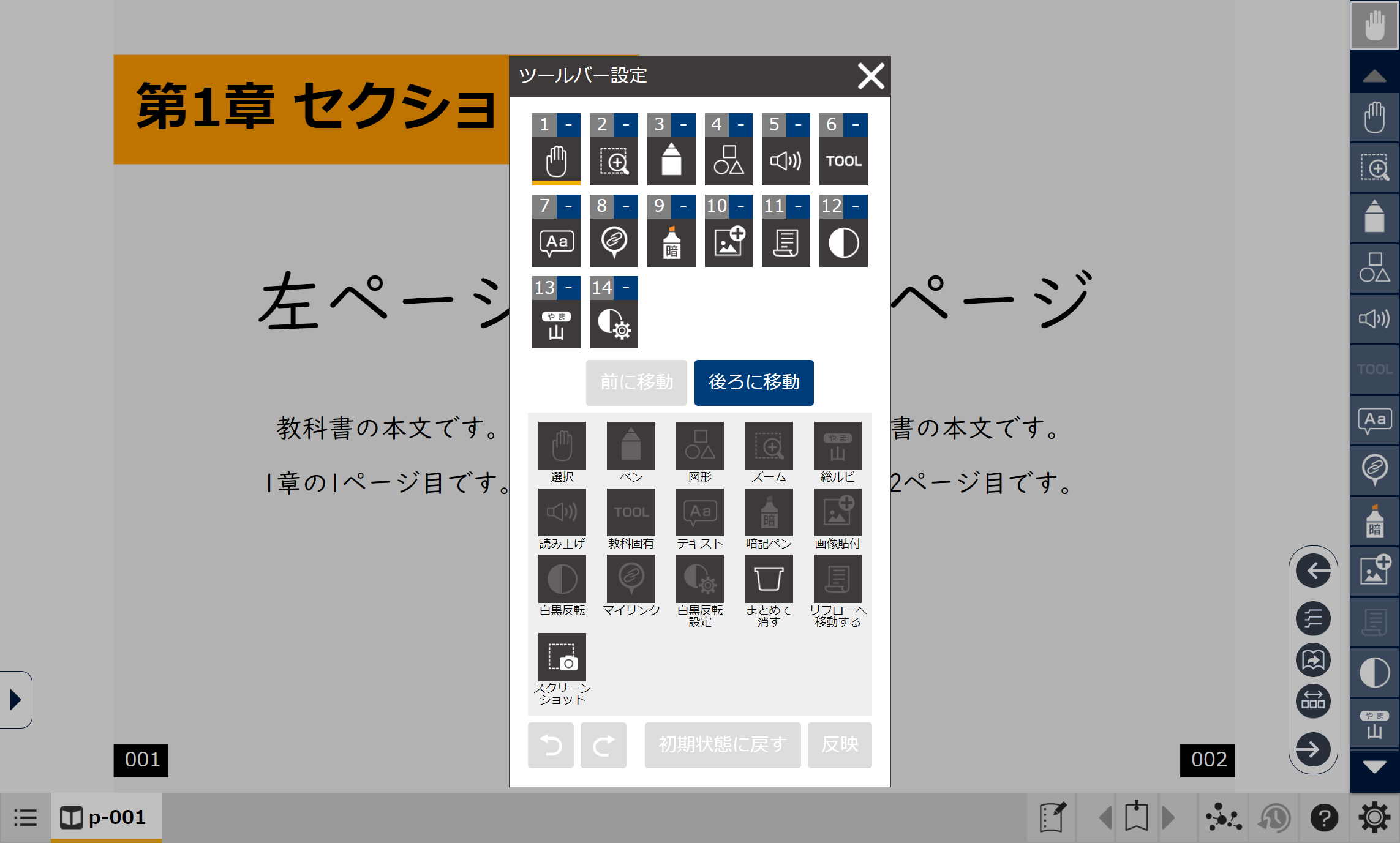 アイコンの追加、移動をした時も「反映」ボタンを押すことで変更した内容がツールバーに反映されます。