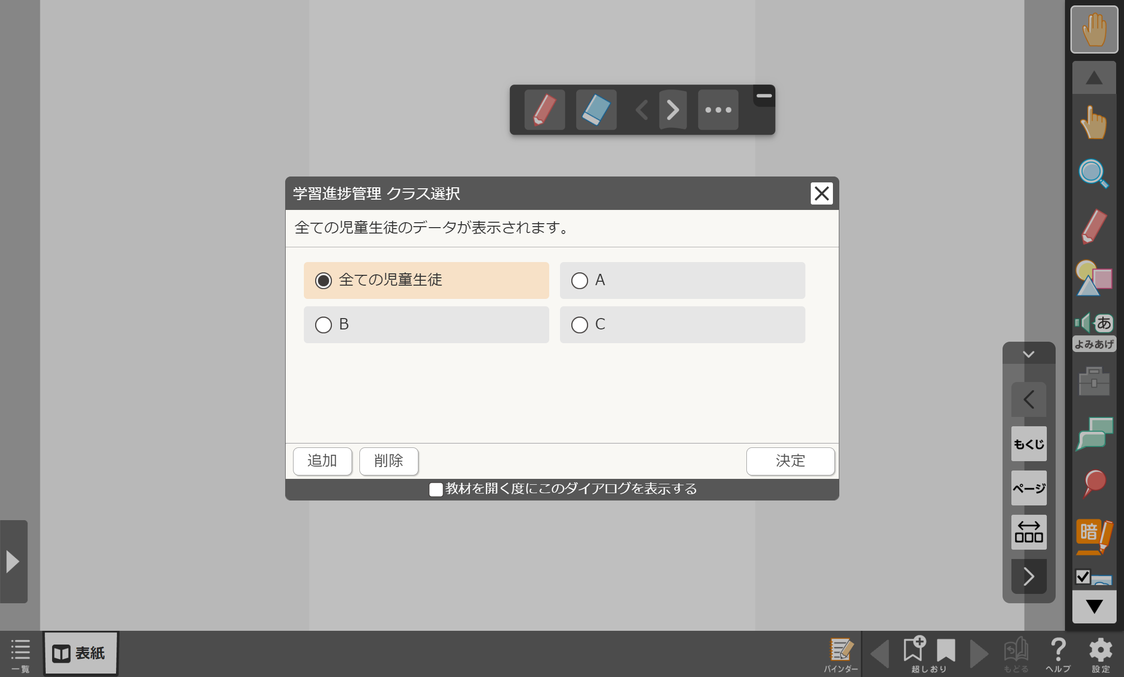 バインダーでは「教科書にもどる」で、バインダーからビューアに切り替えることができます。